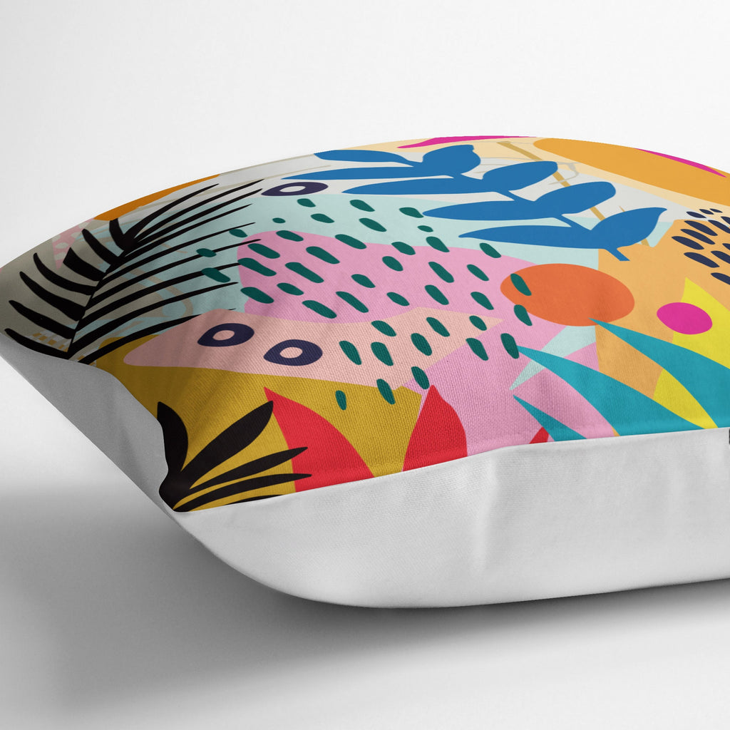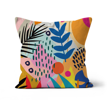 ‘Mischeif’ original illustration by Sei & Ru. This abstract design cushion will add a touch of vibrant colour to any space. Single sided in design and white on the back with a zipper and filled with a fibre fill which can also be removed.