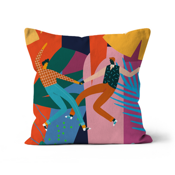 ‘Dancing With My Love’ original illustration by Sei & Ru. This abstract design cushion will add a touch of vibrant colour to any space. Single sided in design and white on the back with a zipper and filled with a fibre fill which can also be removed.