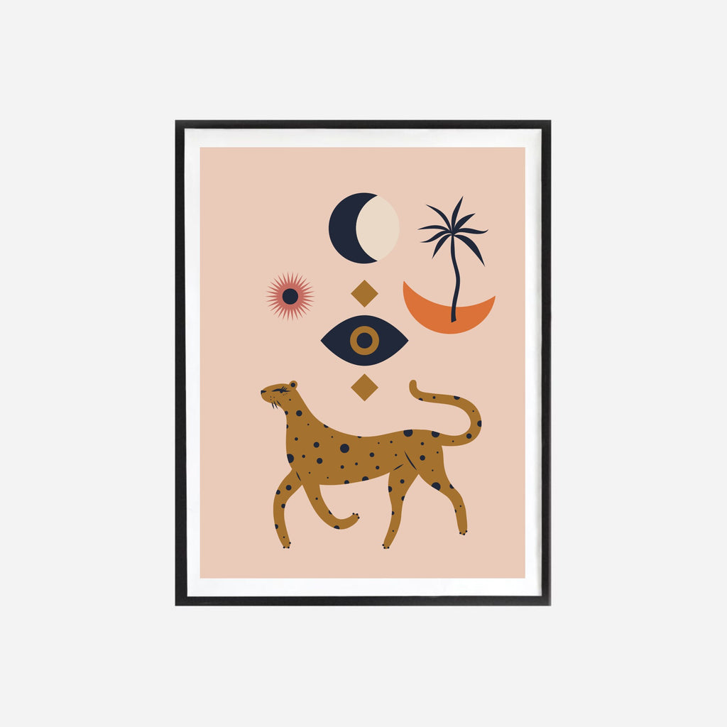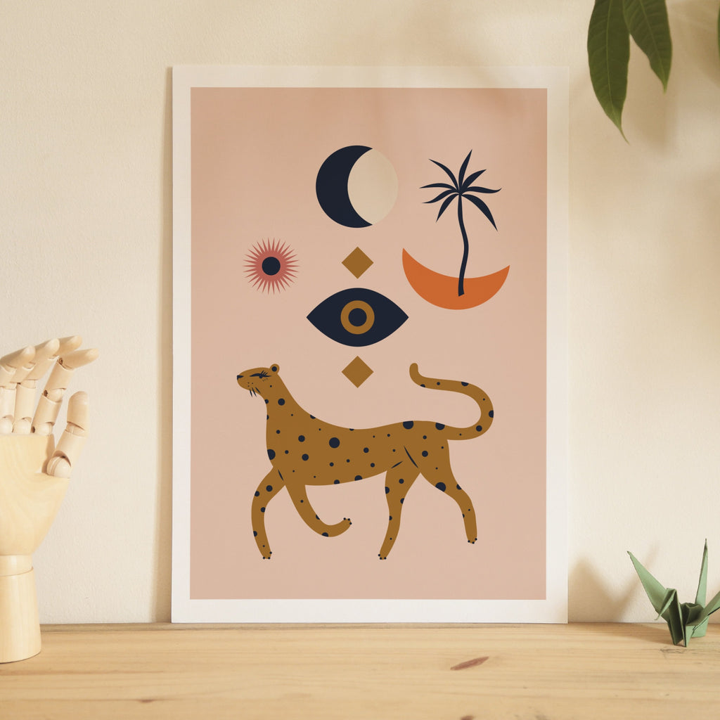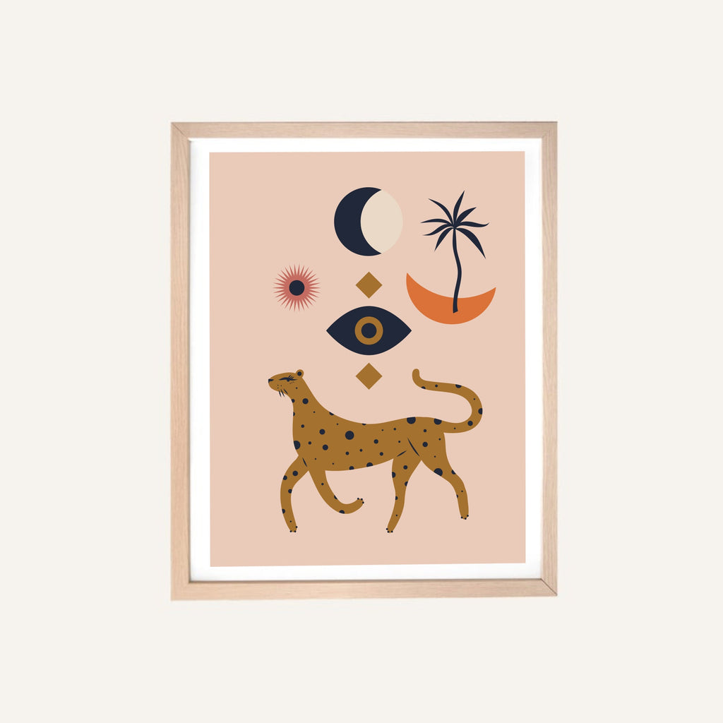 'Dreaming Leopard'. A beautiful, cool, bohemian style art print.