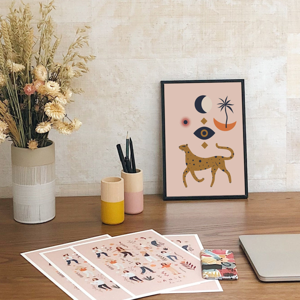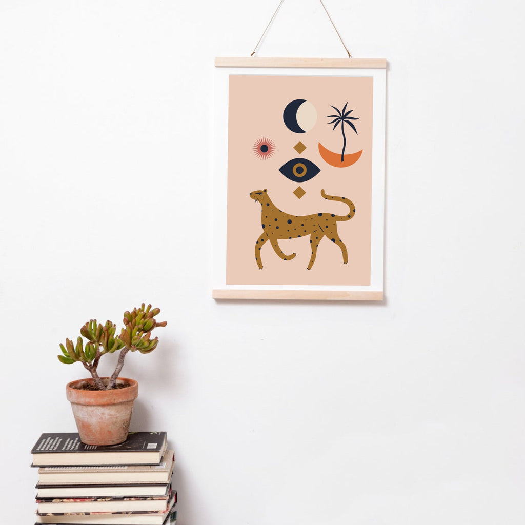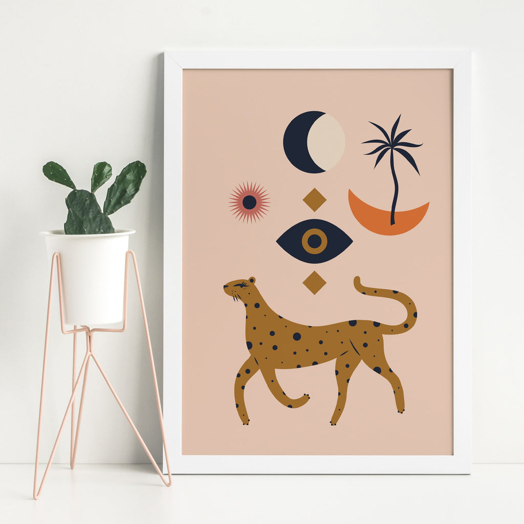 'Dreaming Leopard'. A beautiful, cool, bohemian style art print.